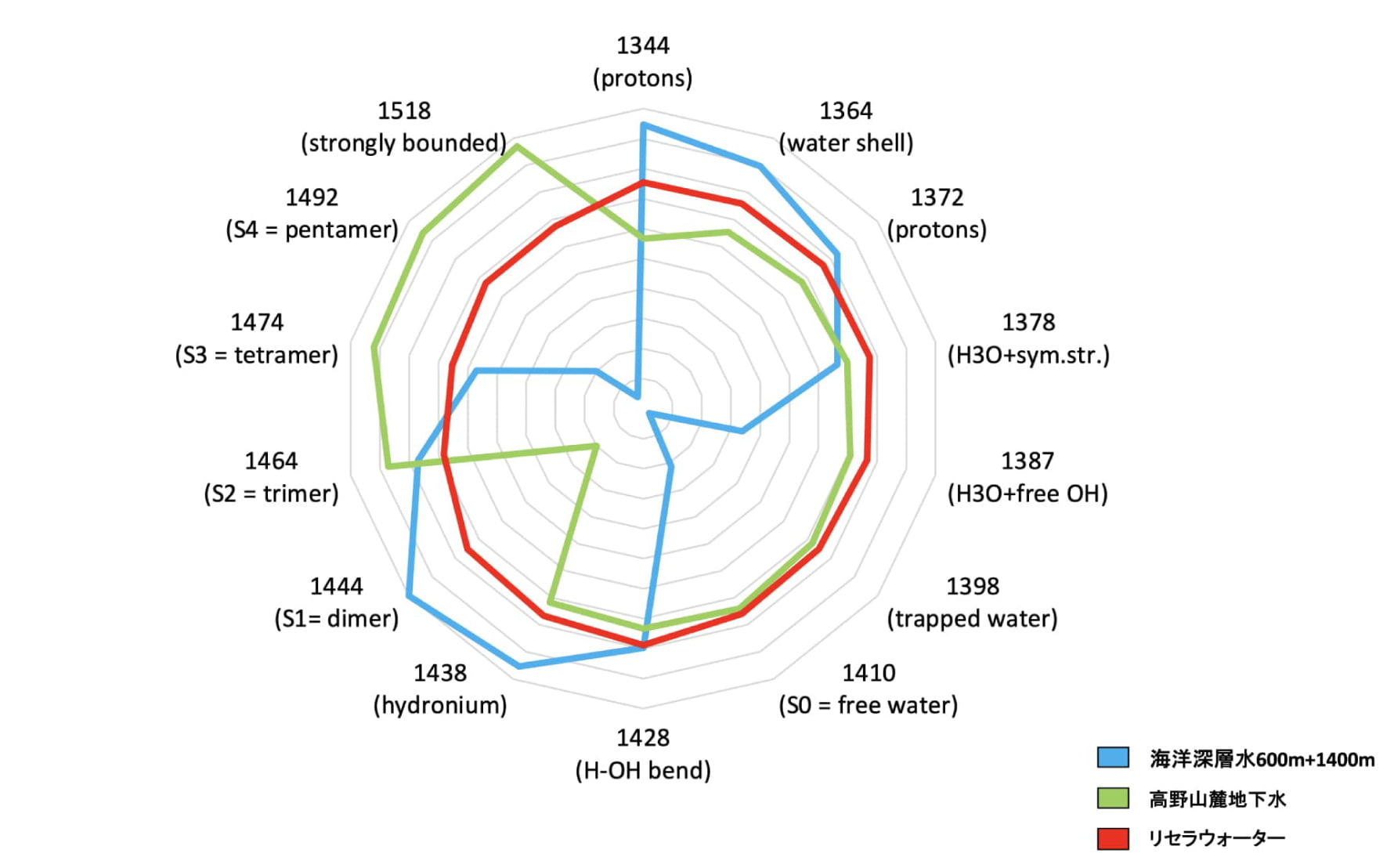 リセラウォーターのアクアグラム®は、様々な種類の水分子構造のバランスがよく、環境や身体への適応性が良好であることが示されました。