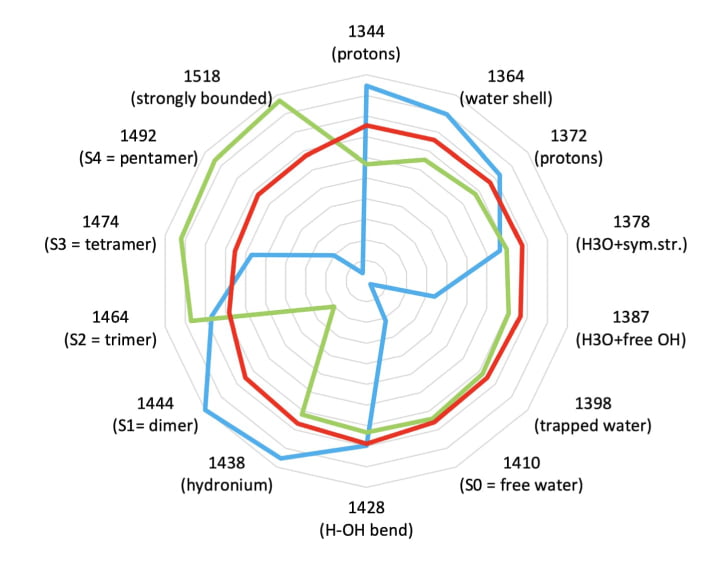 アクアグラム®とは、アクアフォトミクス理論に基づき、水のスペクトルデータ分析において、検出される各水分子構造に密接に関連する水の機能を表したグラフです。