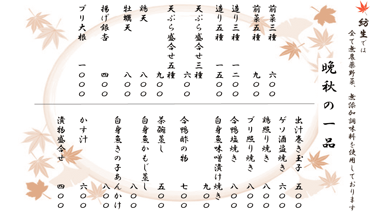 香楽割烹 紡生(つむぎ)では、一品料理の提供を開始いたしました。コースでは味わえない、一品料理をご提供しております。紡生の食材は全て無農薬野菜・無添加調味料を使用しています。