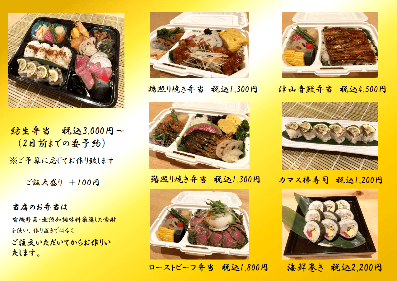 厳選した食材・無農薬野菜・無添加調味料を使ったお弁当を販売しております。 当店のお弁当はご注文いただいてからお作りいたしますので、 出来立てのお弁当をお召し上がりいただけます。
