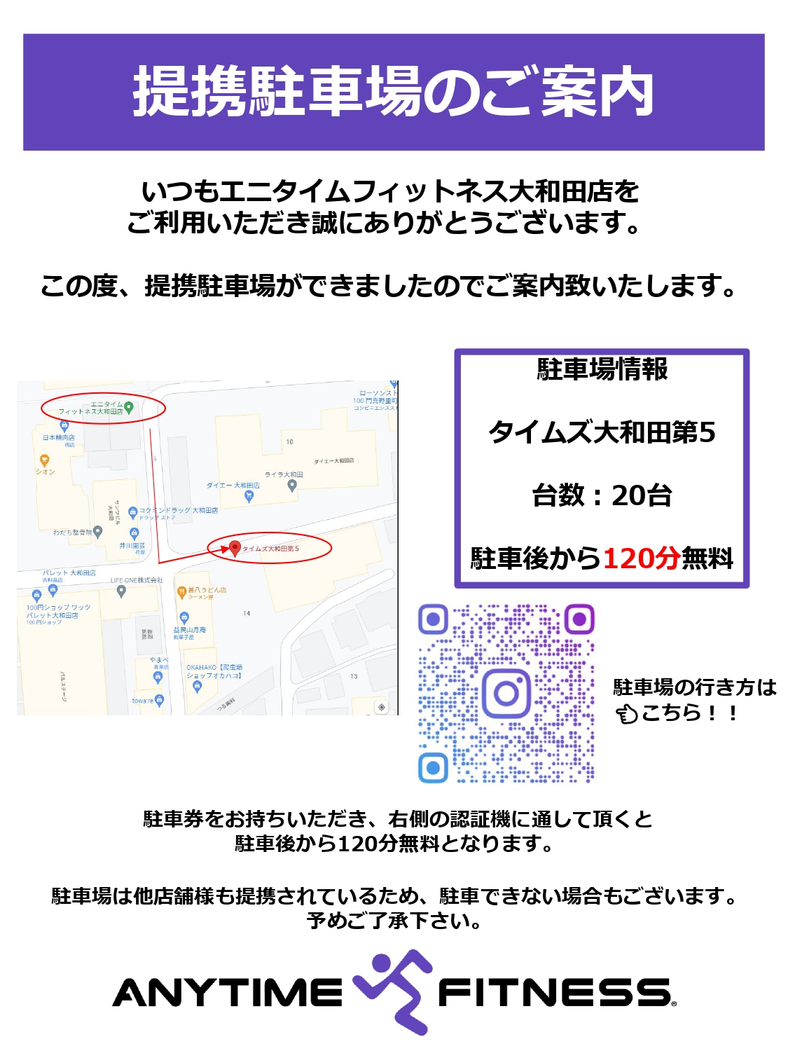 エニタイムフィットネス今福鶴見店にて、現在提携している駐車場に加え、新たな駐車場との提携を開始し、駐車できる台数は2倍以上となりました。