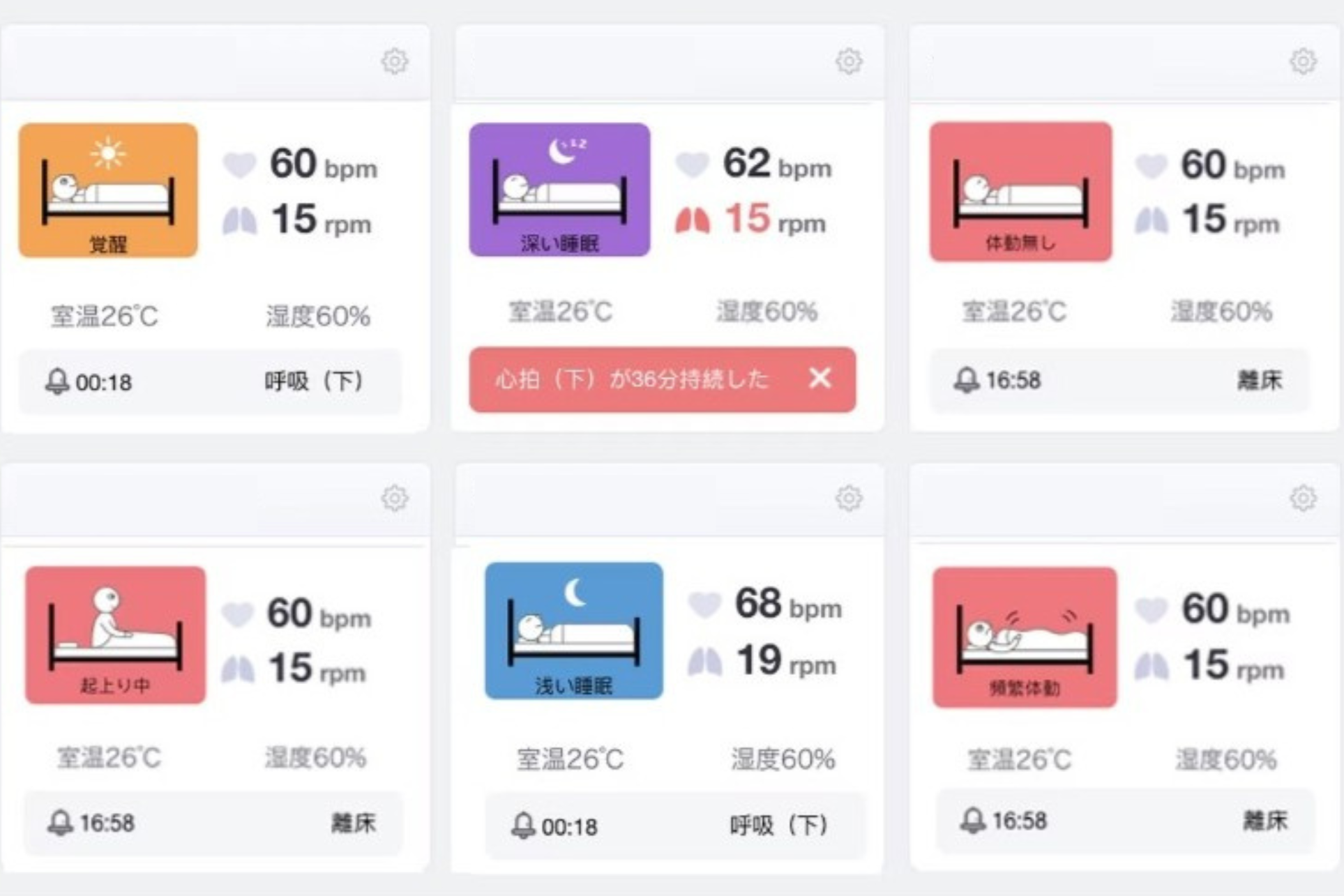 入居者さまの安全確認のため就寝時の見回りを行う中で、睡眠の妨げにならずに入居者の状況を把握できるよう、今回新たに、心拍や睡眠状態を確認できるセンサーをベッドに設置いたしました。